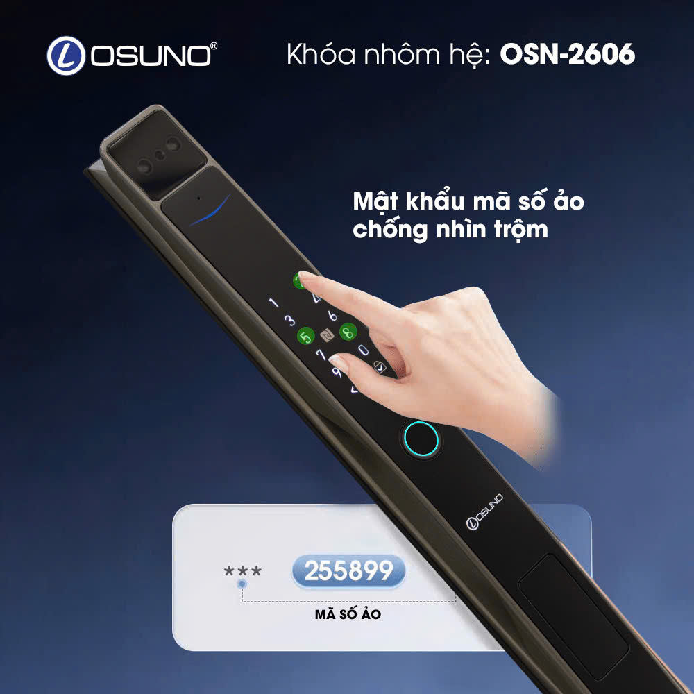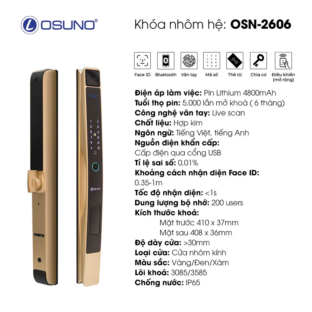 Khóa OSUNO-2606 là sự kết hợp phù hợp giữa công nghệ nhận diện khuôn mặt (Face ID) tiên tiến và khả năng kết nối Wi-Fi trực tiếp. Với thiết kế “siêu mỏng” chuyên dụng cho các dòng cửa nhôm hệ (Xingfa, nhôm kính, sắt hộp), OSNO-2606 mang đến trải nghiệm mở khóa từ xa không giới hạn khoảng cách, giúp bạn làm chủ an ninh ngôi nhà dù ở bất cứ đâu.